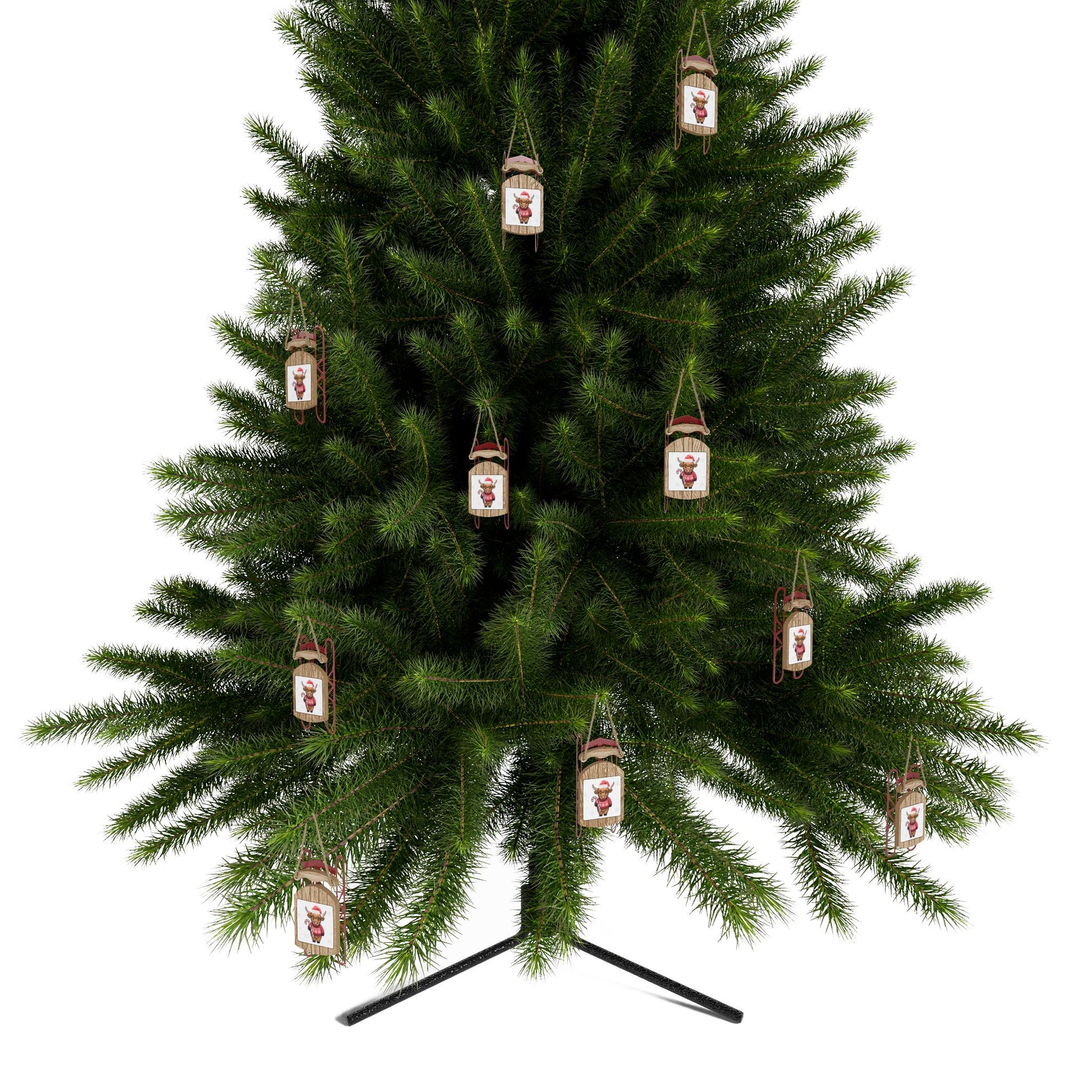Adorable ornament featuring a cute highland cow dressed up in a holiday sweater on a sled, perfect for adding a festive touch to your Christmas tree or holiday decor. Ideal for animal lovers and those who appreciate charming holiday decorations. Perfect for Christmas and winter celebrations.
